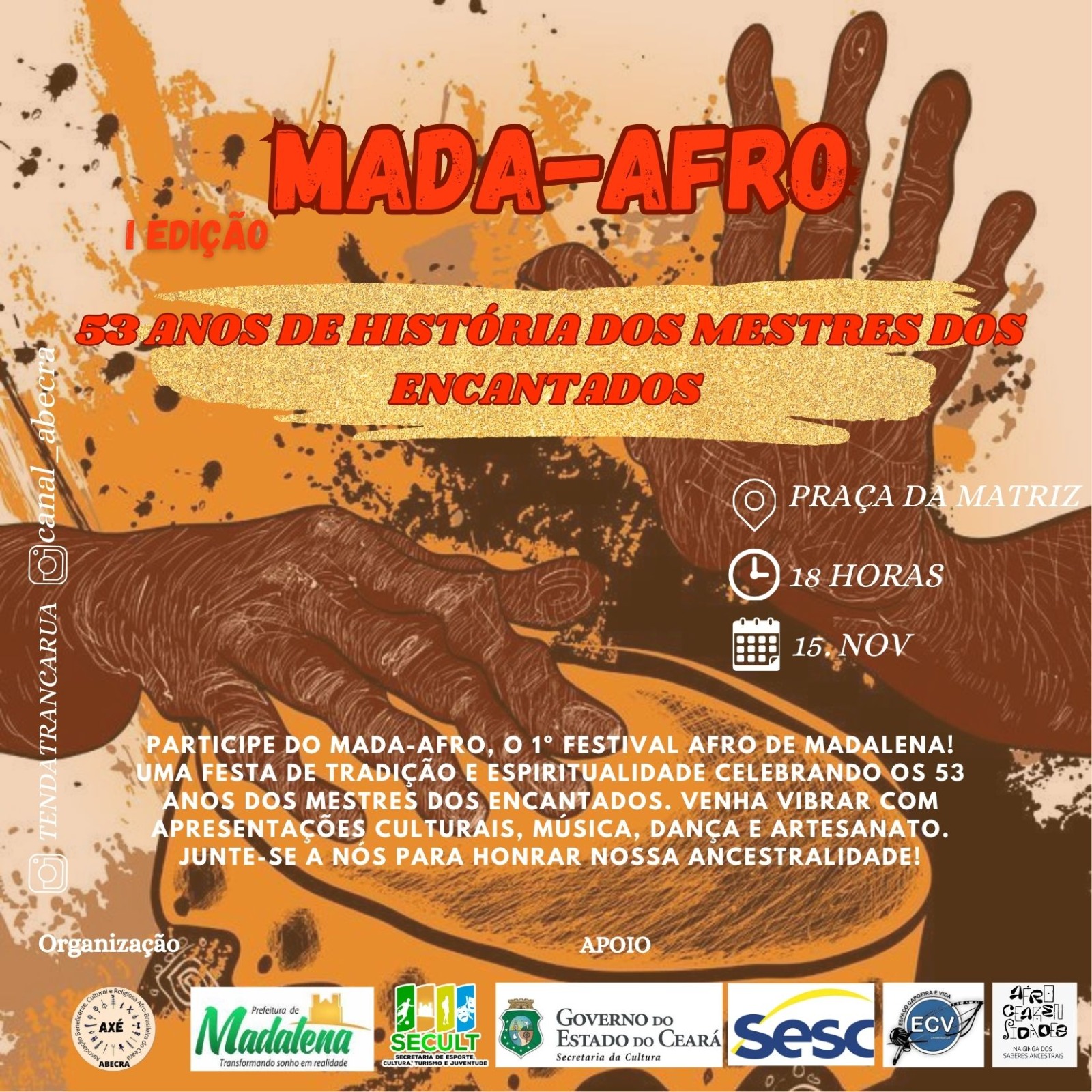 ponto de cultura nacional a Associação Beneficente, Cultural e Religiosa Afro-Brasileira do Ceará, legalizada judicialmente em cartório oficio notas e registro de Madalena Assis Bezerra em 27/11/2020, fundada em 26 de agosto de 2020, tendo à frente como presidente, Josimar Alves Torres Serafim (pai Josimar de Tranca Rua). Nosso trabalho social foi reconhecido no municipio de Madalena-Ce com a LEI MUNICIPAL-682/2023 UTILIDADE PÚBLICAMUNICIPAL ,DECLARA DE UTILIDADE PÚBLICA ESTADUAL LEI N.° 19.033, DE 11.09.24 A ASSOCIAÇÃO BENEFICENTE, CULTURAL E RELIGIOSA AFRO-BRASILEIRA DO CEARÁ ,trabalha na perspectiva da construção de políticas públicas para a Igualdade Racial e para o Povos de Terreiro. Tem como missão a luta pelos Direito Humanos, com ênfase nas questões de gênero e raça, a partir de uma articulação entre os movimentos sociais e instituições governamentais e não-governamentais, que trazem em suas diretrizes a luta pela promoção da igualdade em comunidades tradicionais e assuntos afins. Nossa Associação vem divulgando a nossa Cultura Afro-brasileira no tocante às religiões de Matrizes Africanas e afro-brasileira, desenvolvendo atividades Culturais e Sociais em Madalena no estado do Ceará, para dar visibilidade a essa Cultura Ancestral e suas nuances regionais. Neste processo, se dispõe a atividades de difusão dessa Cultura Tradicional dos Povos de Terreiro do Sertao Central e Sertao Caninde para estabelecer vínculos com a sociedade,preconceitos contra a comunidade LGBTQIA+. na busca de fraternidade, solidariedade, e compreensão mútua entre as Culturas e religiões praticadas no Brasil e em especial na cidade de Madalena no Estado do Ceará.