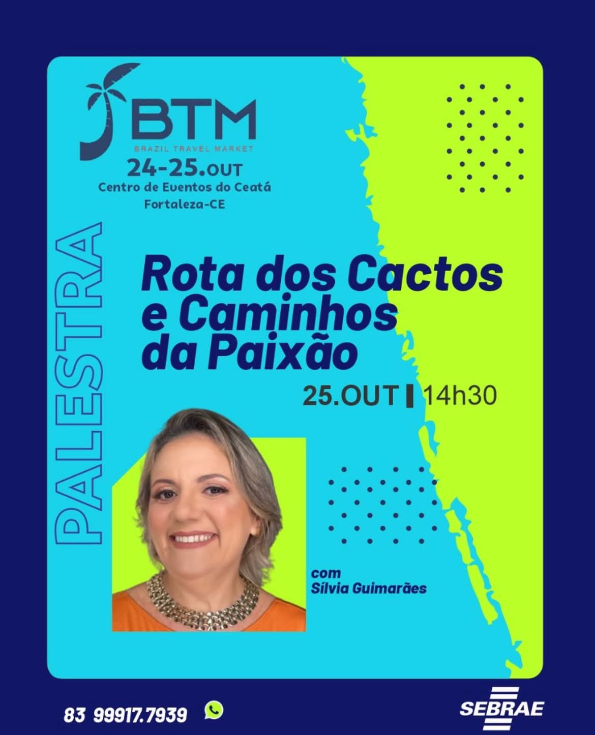 Silvia Guimarães é turismóloga, pós-graduanda em Turismo e Sustentabilidade IFCE Fortaleza. Atualmente, preside a ABBTUR Ceará . Como Consultora em Turismo coordena eventos técnicos, digitais, congressos e oficinas no setor. Atuou como Agente SEBRAE na Paraíba, onde desenvolveu projetos de governança e Empreendedorismo feminino, regionalização do turismo. Está vice-presidente da Fundação CEPEMA e lidera iniciativas sustentáveis como o Projeto Internacional do Café de Sombra. Já ministrou mais de 30 palestras, integrando temas como ecoempreendedorismo e turismo rural, governança, soluções digitais na promoção dos produtos turísticos - @silvia.gturismo