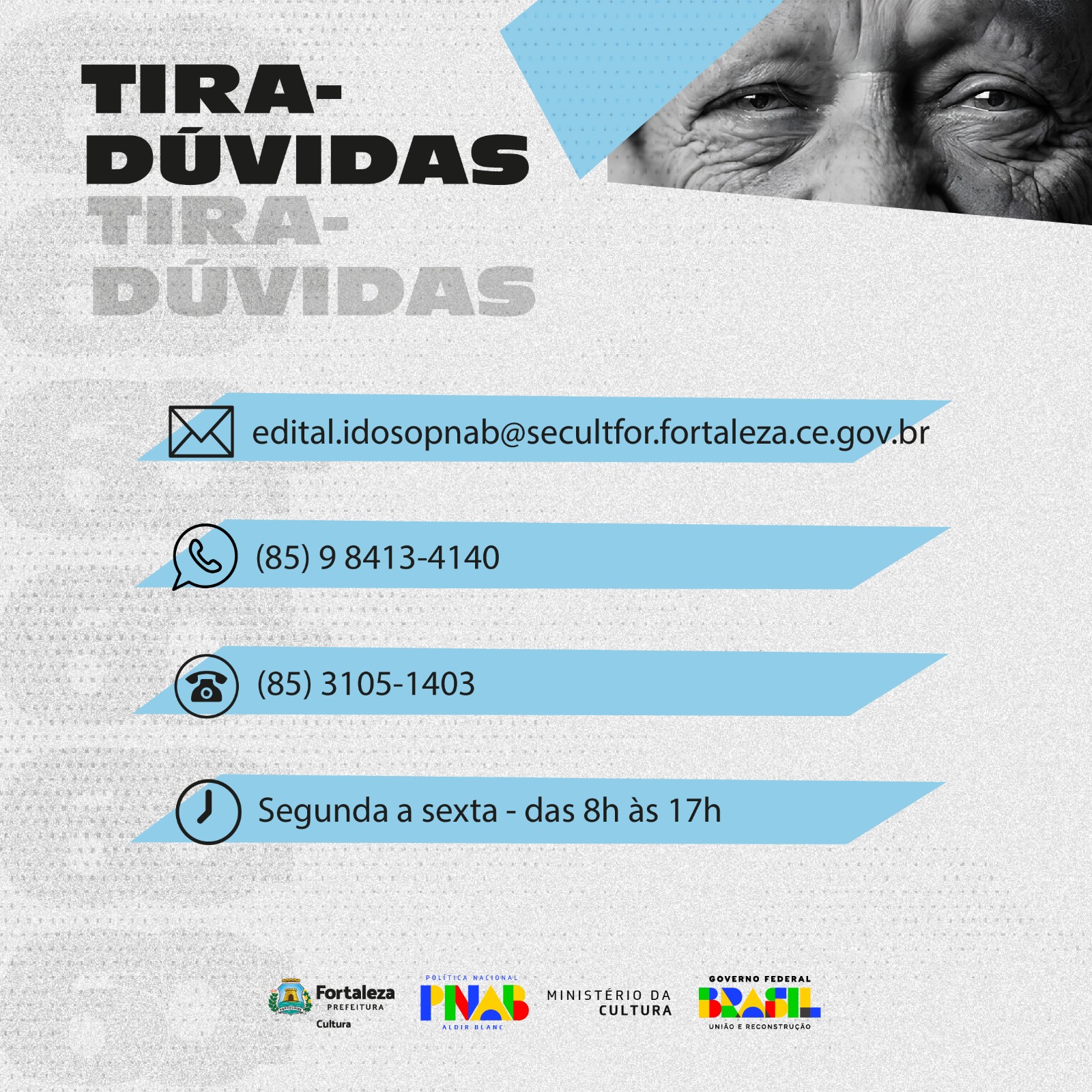 AS DÚVIDAS RELACIONADAS AO PROCESSO DE INSCRIÇÃO NO MAPA CULTURAL SERÃO SANADAS NO HORÁRIO COMERCIAL, DE SEGUNDA A SEXTA, DAS 8 (OITO) ÀS 17 (DEZESSETE) HORAS, ATRAVÉS DO ENDEREÇO ELETRÔNICO EDITAL.IDOSOPNAB@SECULTFOR.FORTALEZA.CE.GOV.BR OU CONTATO WHATSAPP (85) 9 8413-4140 OU (85) 3105-1403.