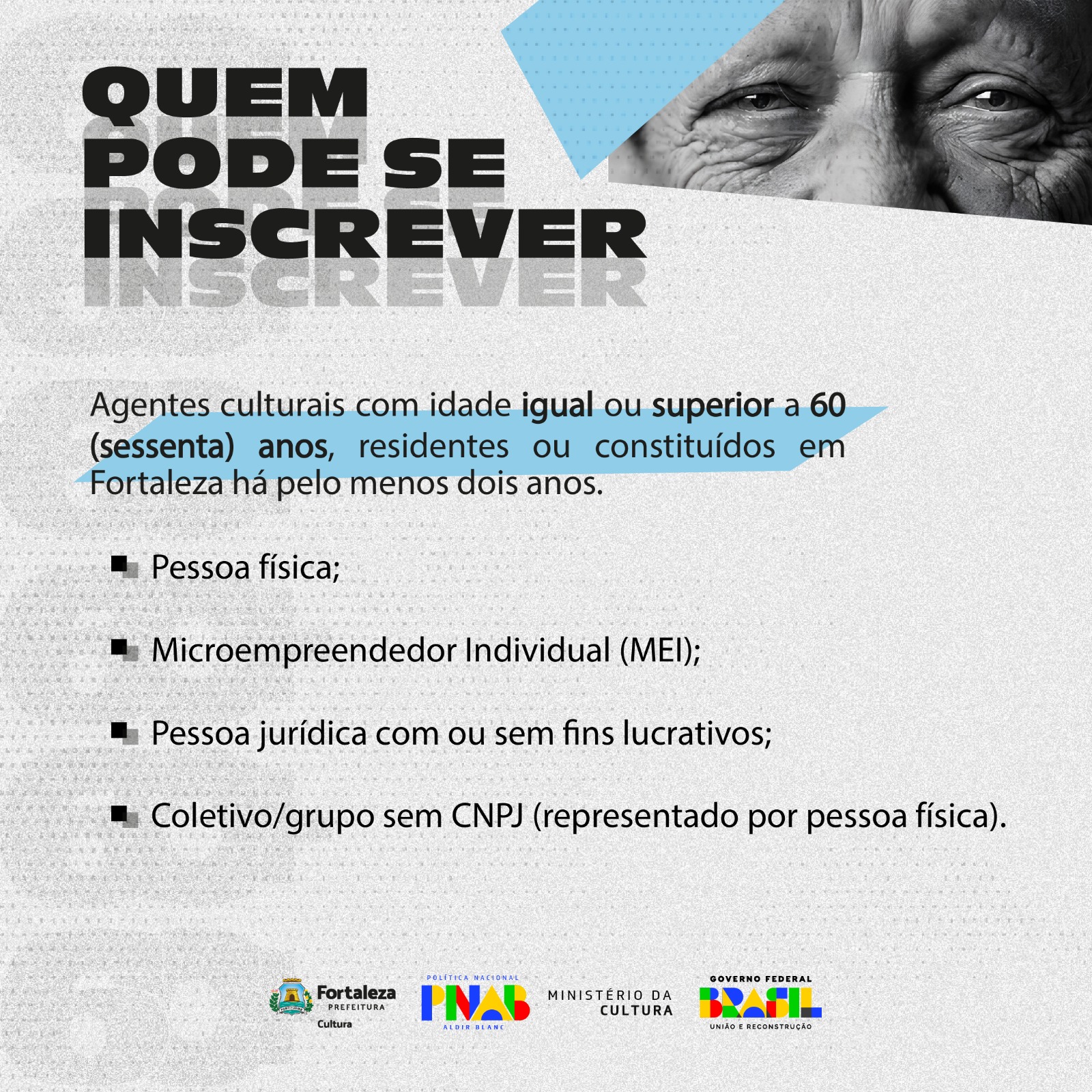 PODERÃO SE INSCREVER NO EDITAL QUALQUER AGENTE CULTURAL, PESSOA FÍSICA OU JURÍDICA, COM IDADE IGUAL OU SUPERIOR A 60 (SESSENTA) ANOS, RESIDENTE E DOMICILIADO(A) NO MUNICÍPIO DE FORTALEZA HÁ, NO MÍNIMO, 02 (DOIS) ANOS.