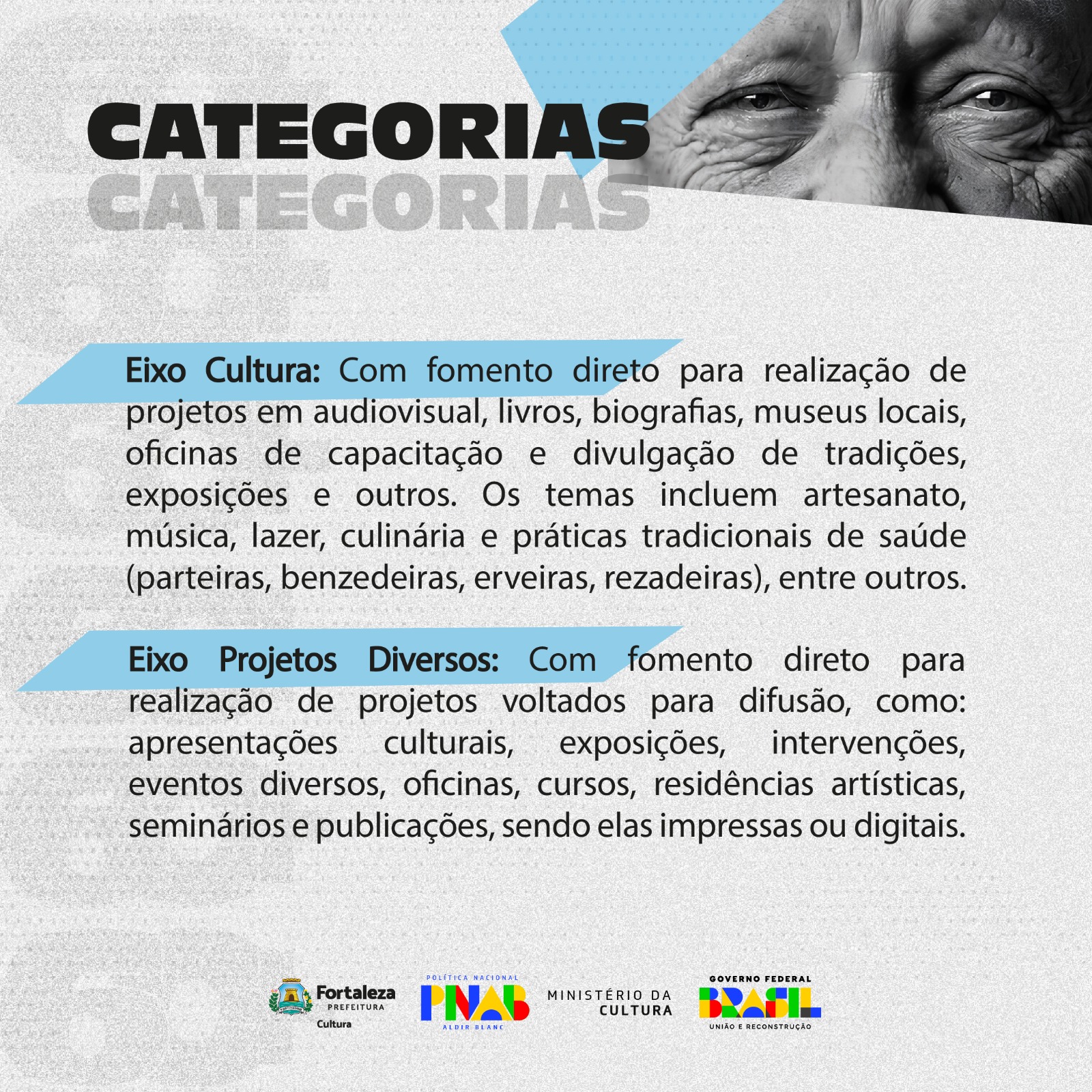 CONSTITUI OBJETO DESTE EDITAL O FOMENTO A 30 (TRINTA) PROJETOS DE BAIXO ORÇAMENTO NAS DIVERSAS FORMAS DE MANIFESTAÇÕES, VOLTADOS PARA OS AGENTES CULTURAIS PESSOAS IDOSAS, COM IDADE IGUAL OU SUPERIOR A 60 (SESSENTA) ANOS, QUE RESIDEM NO MUNICÍPIO DE FORTALEZA, NA PERSPECTIVA DA VALORIZAÇÃO CULTURAL, PRESERVAÇÃO DE SABERES, CONTINUIDADE DA MEMÓRIA E VALORIZAÇÃO DA ANCESTRALIDADE. CONSIDERANDO O DIREITO DA PESSOA IDOSA, BEM COMO O COMPROMISSO EM PROMOVER POLÍTICAS PÚBLICAS QUE GARANTAM O DIREITO DE ENVELHECER PARA TODOS, ESTE EDITAL É APRESENTADO COM O OBJETIVO DE IMPULSIONAR A PROMOÇÃO, PROTEÇÃO E DEFESA DOS DIREITOS HUMANOS DAS PESSOAS IDOSAS QUE RESIDEM NO MUNICÍPIO DE FORTALEZA, DESENVOLVIDOS POR PESSOAS FÍSICAS OU JURÍDICA, POR MEIO DO RECURSO RECEBIDO COM BASE NO ART. 9º, § 1º, DO DECRETO Nº 11.740/2023, QUE REGULAMENTA A LEI FEDERAL Nº 14.399/2022 - POLÍTICA NACIONAL ALDIR BLANC; E NA LEI FEDERAL NO 10.741/2003 - ESTATUTO DO IDOSO.
